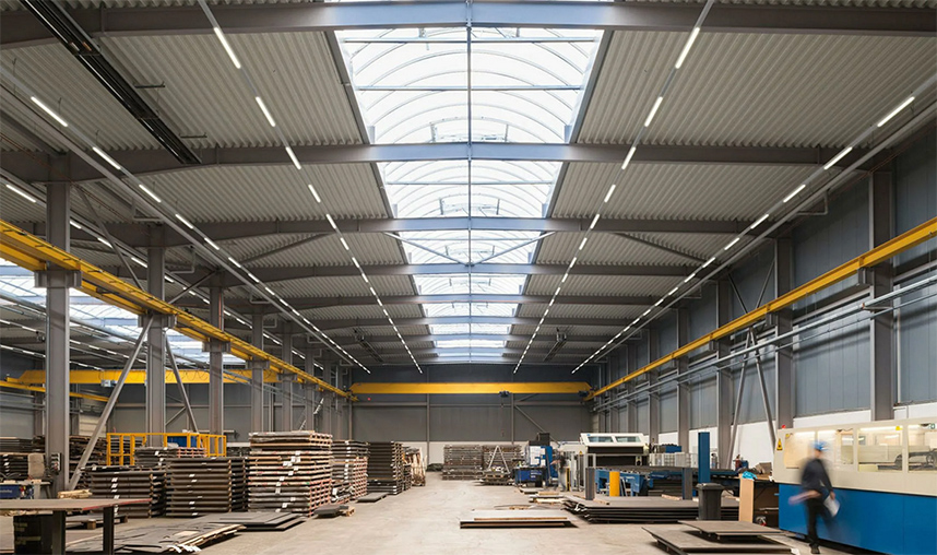 Для агрессивной среды выбирают линейные светильники IP65/IK08. При высоте > 8 м эффективны UFO-HighBay 200 Вт с узкой Г-КСС и оптикой 60° — освещение производственных помещений при этом соответствует норме, а число светильников уменьшается на 25 %.