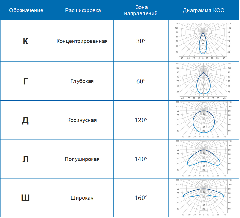 Тип КСС светодиодных светильников: полная классификация